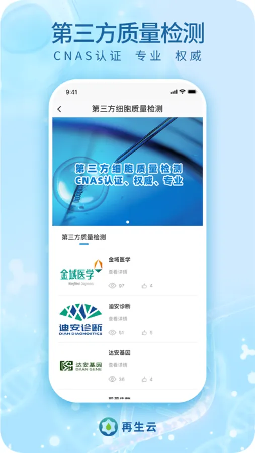 再生云诞生于 2019 年 5 月,是国内再生医疗服务工具;目前已整合全国百余家细胞制备公司,满足消费者各种细胞类型的存储与应用服务;再生云也与百余再生医学领域的专家建立了合作,为用户科普干细胞与再生医学的相关知识。