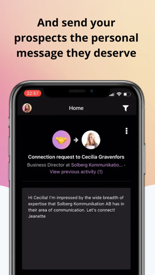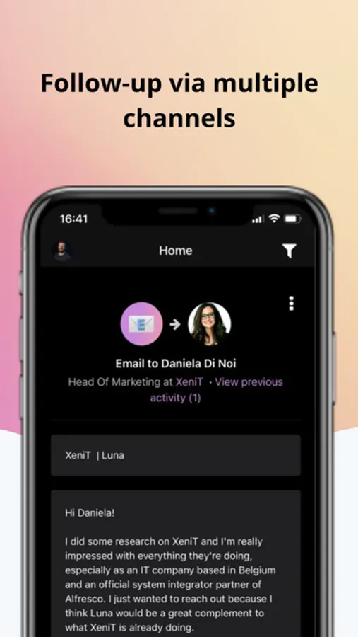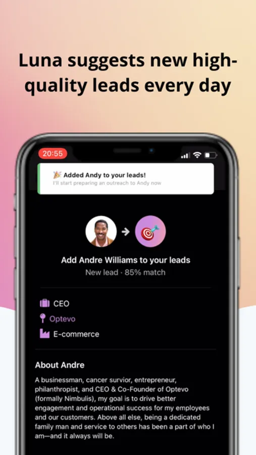 Luna suggests new high-quality leads to reach out to and writes personalized cold emails as if you've hired a professional to write them for you. With every interaction you have with Luna, Luna gets smarter. As soon as someone responds, Luna automatically updates your CRM so you keep on track of every conversation.
