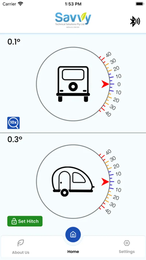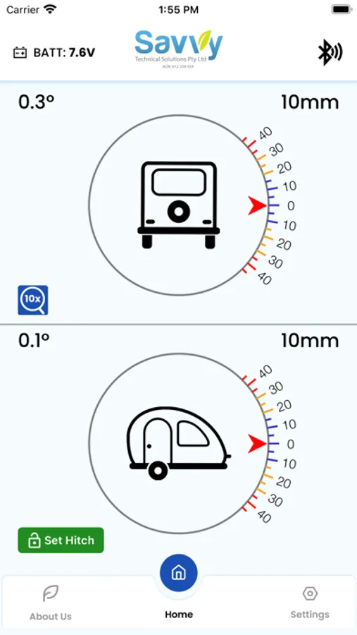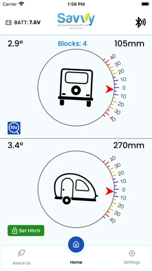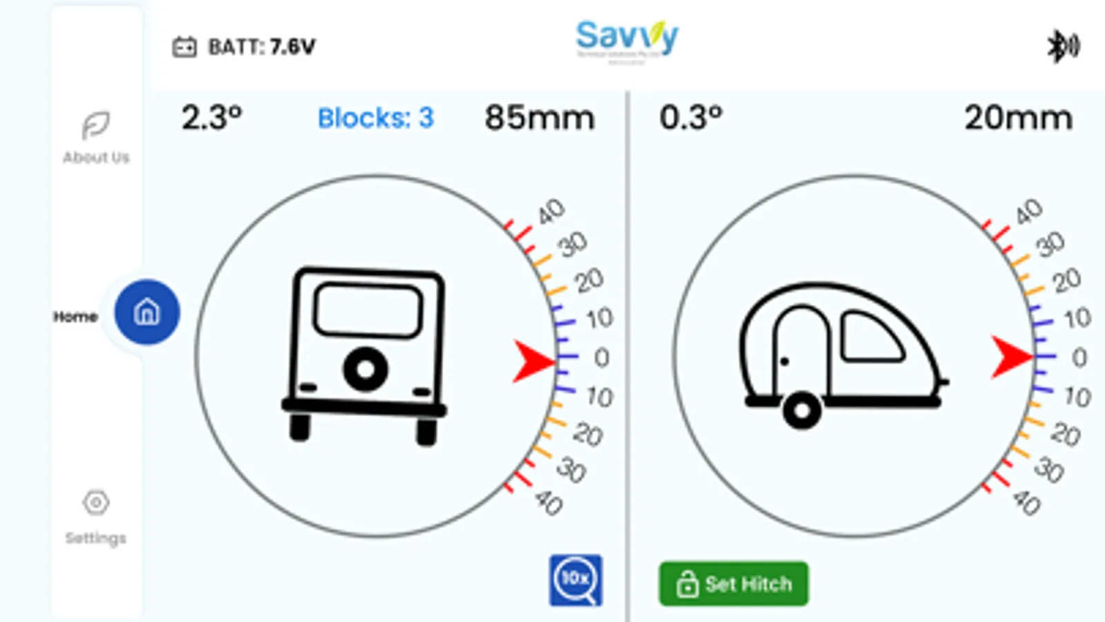 This app communicates, via Bluetooth, with the SavvyLevel device mounted within the caravan/camper and provides two axis inclination and height correction data with an accuracy of plus or minus 0.1 degree over the full environmental operating range. It reports pitch, roll and adjustment information required to efficiently and perfectly level your caravan/camper single handedly from the comfort of your tow vehicle.
