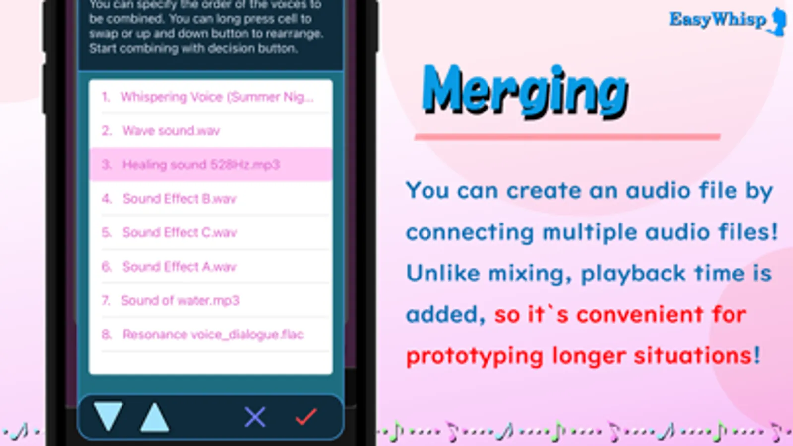 By selecting multiple sounds and specifying the order, you can create a single sound file by concatenating sounds.