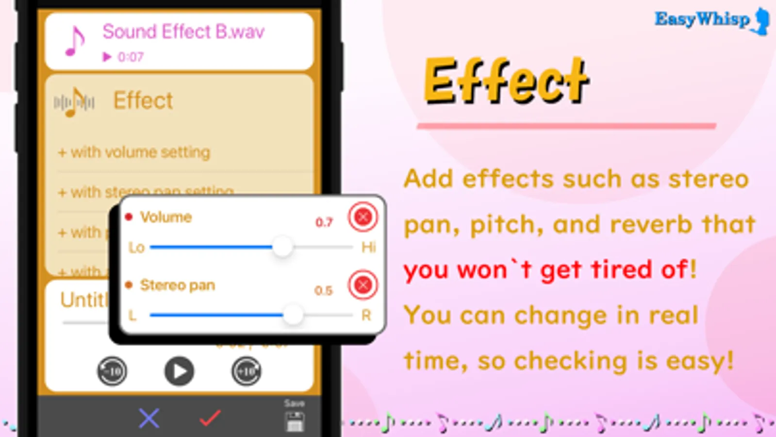 A wide range of effects can be added, including Volume, Stereo Pan, Pitch, Amplification, Distortion, and Reverb.