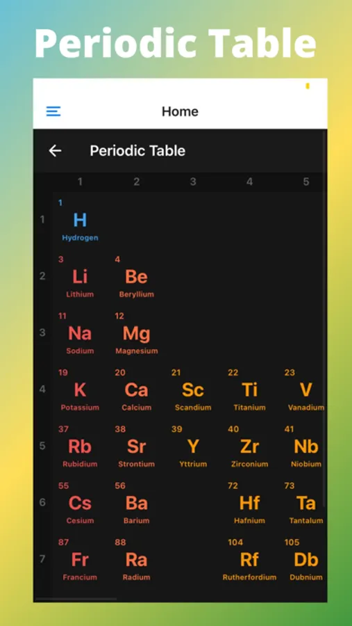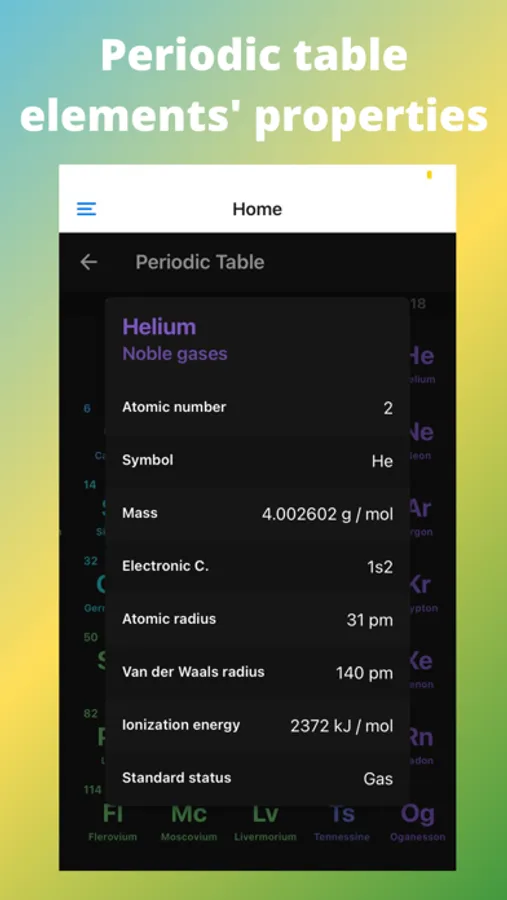 The atomic numbers, weights, symbols, and names of all 118 chemical elements can be studied for free using this app