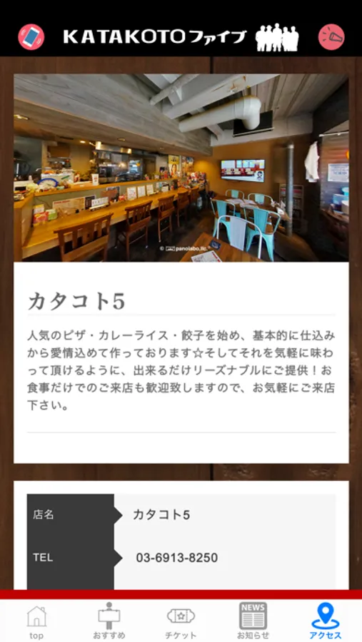 360度パノラマ画像でのお店の内観の閲覧や、お店へのアクセスなどの店舗情報の確認、またお得な情報などの最新のお知らせを確認することができるアプリケーションです。