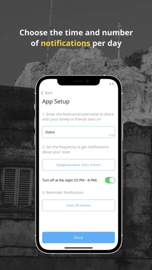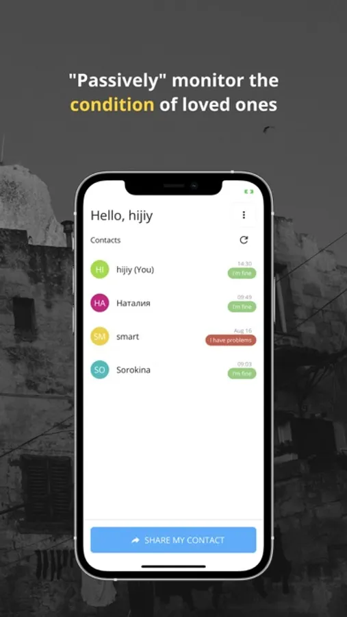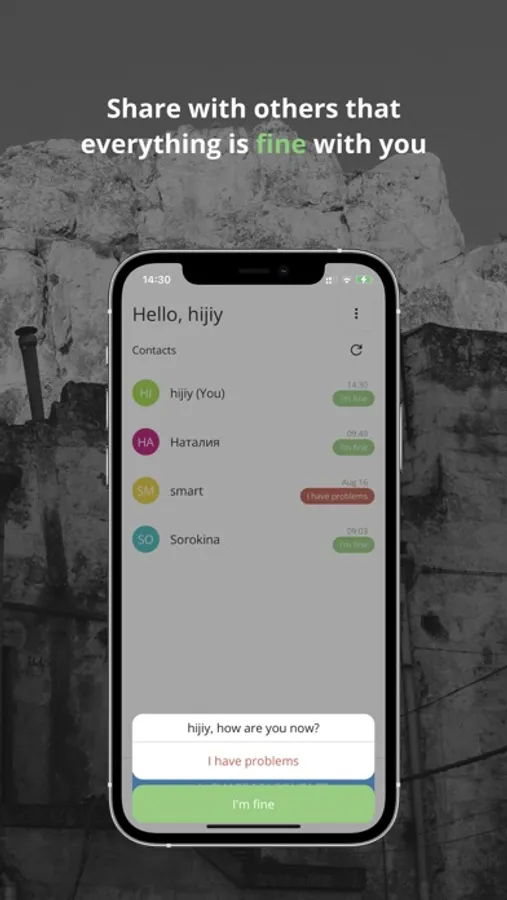 We value freedom and independence, so you can choose intervals for checking your security status. If you have not updated the information in a fixed time and missed the repeated questions - all contacts will be notified that you have a problem.