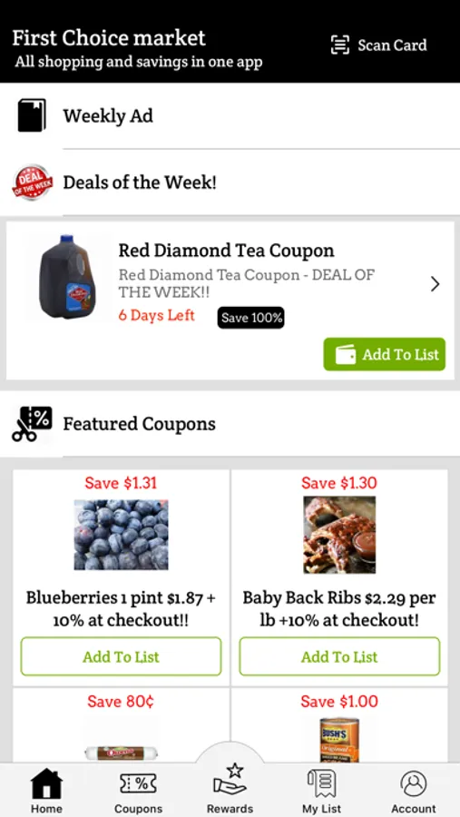 With the First Choice Market app you can claim as many coupons as you want with one simple scan. Gone are the days of sifting through mailers or printing off coupons online, the First Choice Market app brings all the rewards and coupons to your mobile device!