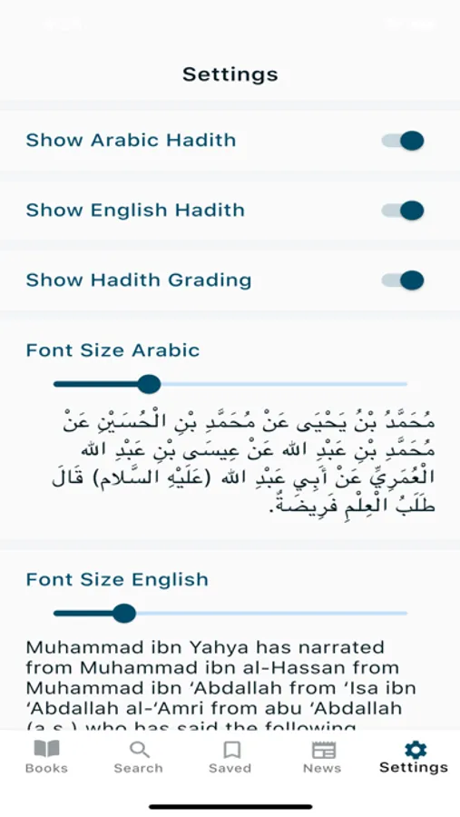 - Customisability as to how you want the aḥādīth to be presented, change font sizes and what you wish to be displayed