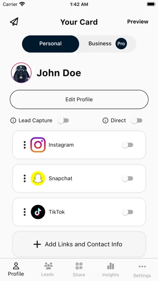 Switch between personal and business profiles with a single click. Share just the details you want for the particular occasion.