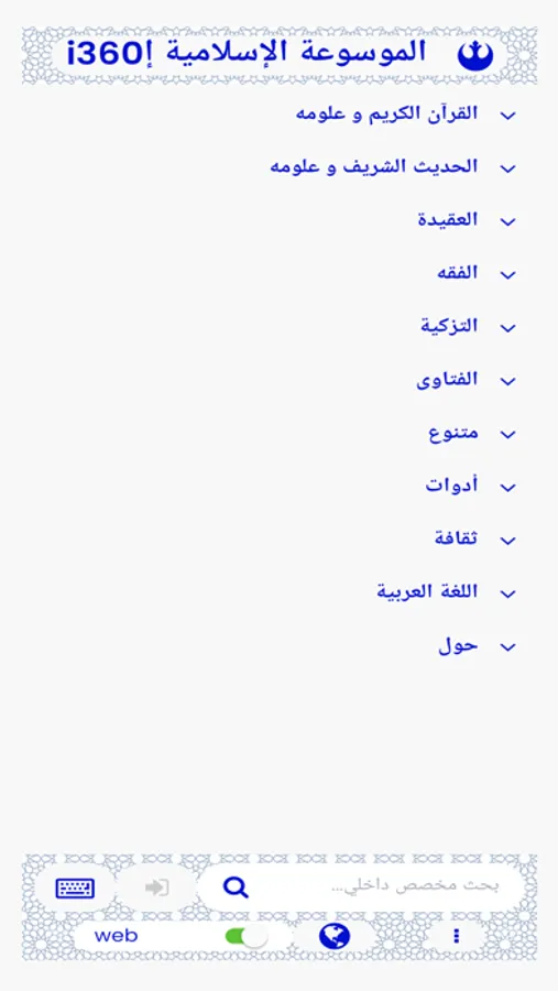 إi360 تطبيق إسلامي موسوعي (كنموذج أولي؛ حالياً) به فهرس لأهم التطبيقات/المواقع/الملفات المُعرفة بالعلوم الإسلامية الأساسية بشكل متكامل مختصر بسيط، و يشمل: