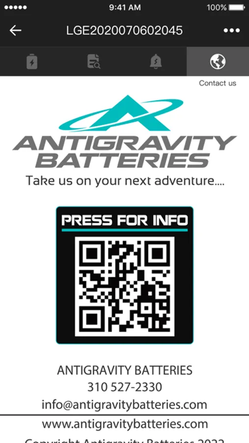 "The ""AntigravityConnect DC"" Battery Monitoring App allows the user to check the real-time Battery Information including State of Charge, Voltage, incoming and outgoing Current, Battery Temperature, as well as providing individual Cell Voltages and Alerts for Battery Status. Note: This application is only suitable for Antigravity DC-xxx Models of our LiFePO4 batteries.