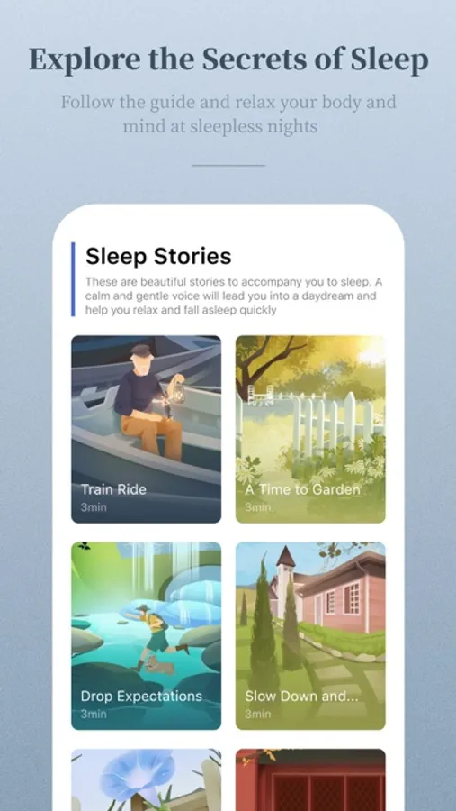 - Sleep stories include: Train Ride, The Story of Maggie, The Golden Hour, Moonlight Journey and etc.