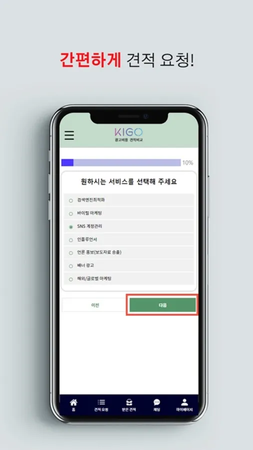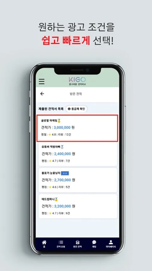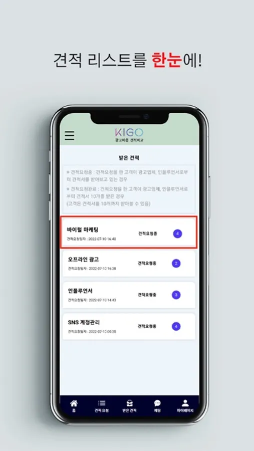 앱에서 요청서 1장을 작성하면 따로 광고업체를 알아볼 필요 없이 다수의 견적(최대 10개)을 받아 비교할 수 있습니다.