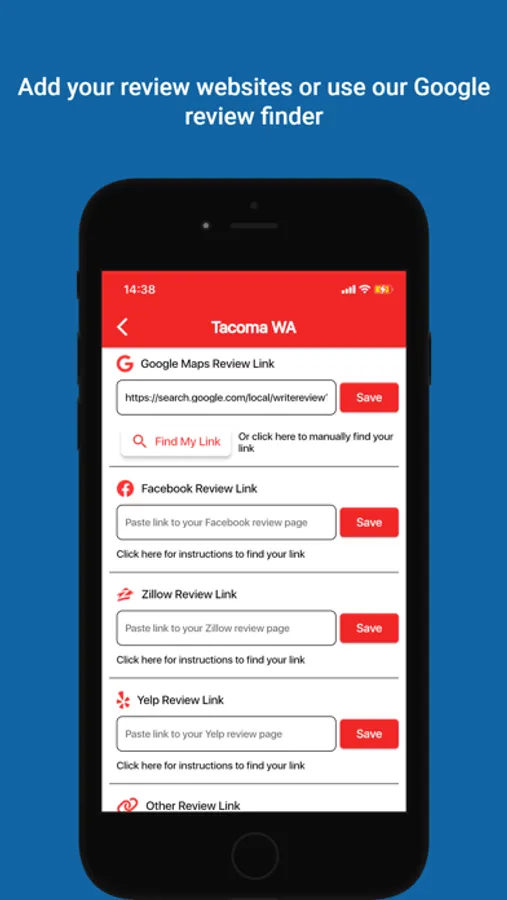 Having a direct link to leave a review gives customers a frictionless way to leave you a review, instead of stopping early if they have many steps to go through. Our app specifically helps you find your Google business listing and extracts the specific review url, that when clicked, takes the client directly to the page where they simply pick a rating and leave a review.