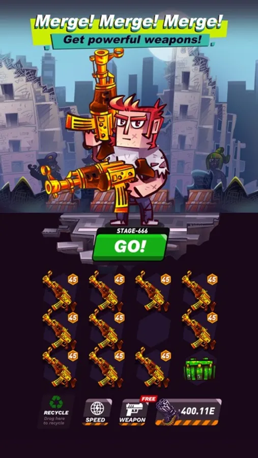 Merge, fire, and unlock collectible weapons in Apocalypse: Zombie Smasher. Want to be the ruler of slaughter? The Savior of the survivors? Who is the transcendence that redeems the infected? Everything is up to you. The doomsday bell has sounded, and the world is waiting for a hero to appear. Begin your legendary road now.