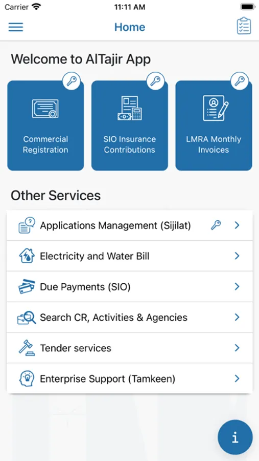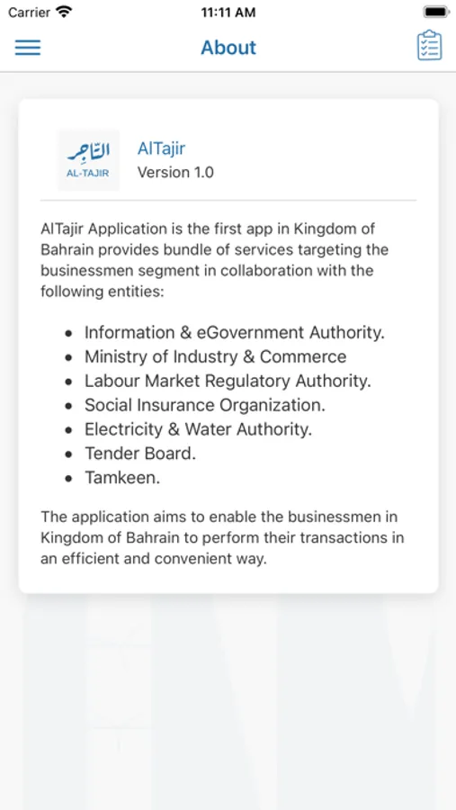 AlTajir Application is the first app in Kingdom of Bahrain provides bundle of services targeting the businessmen segment in collaboration with the following entities:Information & eGovernment Authority, Ministry of Industry and commerce, Market Regulatory Authority, Social Insurance Organization, Electricity & Water Authority, Tender Board and Tamkeen. services as following: