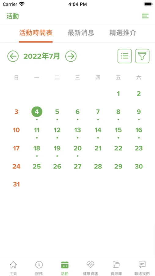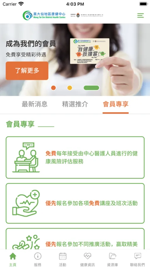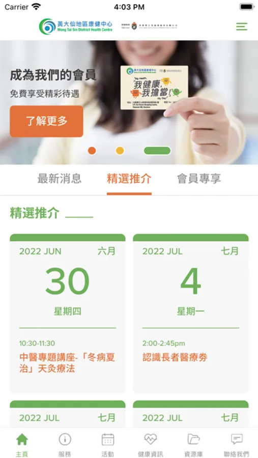 非會員功能:服務內容,活動時間表,精選推介,健康資訊,地區資源庫