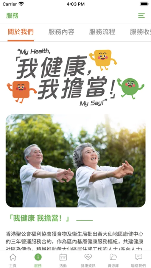 香港聖公會福利協會獲食物及衞生局批出黃大仙地區康健中心的三年營運服務合約,積極推動區內人士關注自我健康管理,登記成為中心會員,即可透過多方位的健康推廣、疾病預防、慢性疾病管理及社區復康支援,主動擔起健康的責任,成為自己的健康擔當!