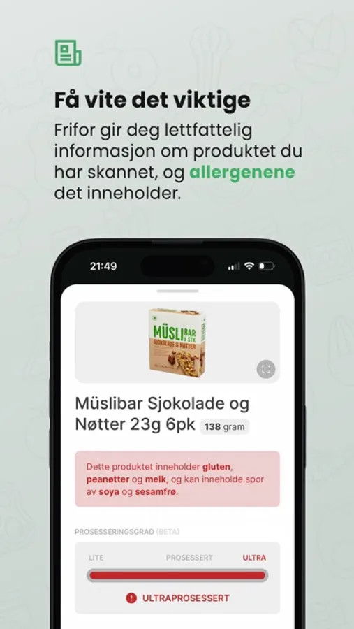 Bruk Frifor til å enkelt finne allergener, tilsetningsstoffer og ultraprosessering i matvarer!