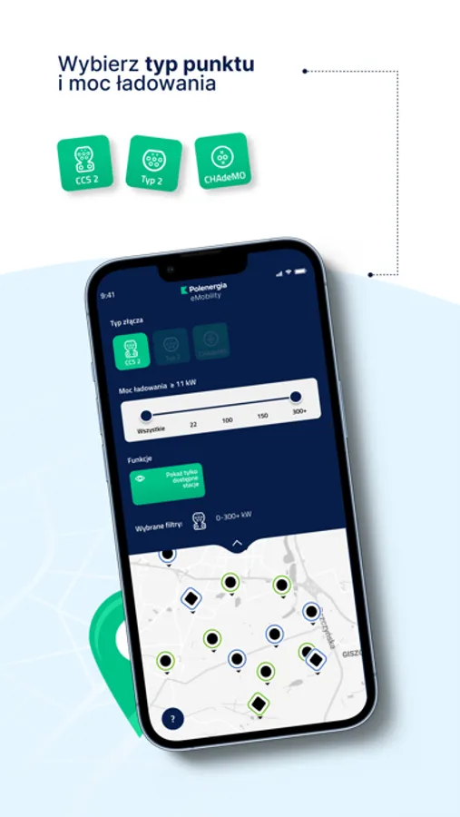 • Wyszukiwanie stacji ładowania z filtrowaniem rodzaju punktu, jego mocy oraz lokalizowania stacji położonych w pobliżu użytkownika
