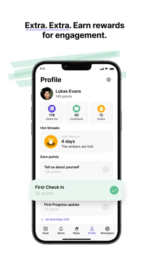 Kudos and comments are just a click away to congratulate your teammates on a job well done; make it personal and earn points along the way. With points come rewards.