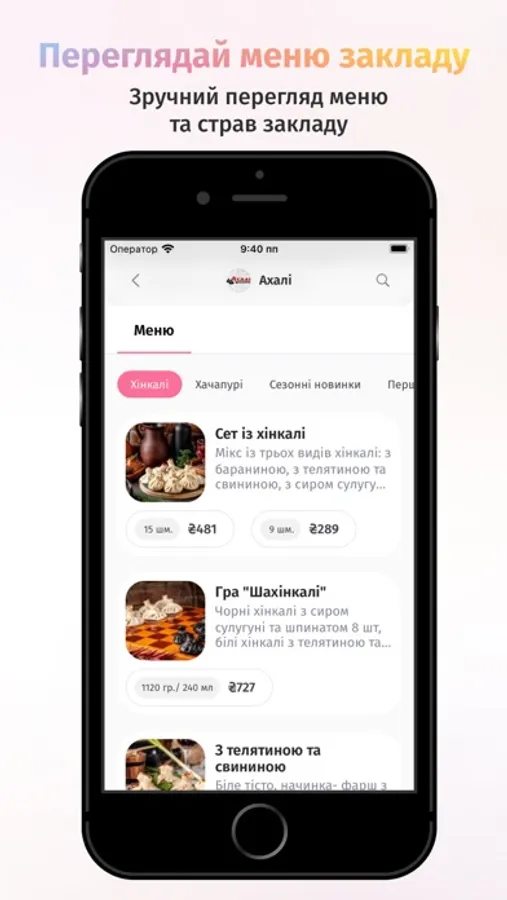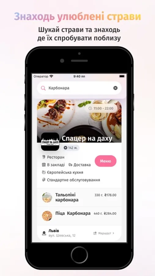 Шукай улюблені страви у закладх, що поруч, швидко та зручно переглядай інформацію про ціну та вміст страви, інгредієнти та об’єм.