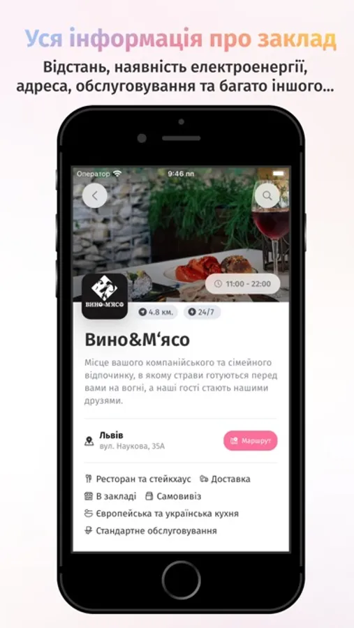 Миттєвий пошук закладів поруч, що відображає усю необхідну інформацію про заклад, робочі години, тип кухні, наявність безперебійного живлення, робота під час повітряної тривоги, спосіб та тип обслуговування, місцерозташування, маршрут та багато іншого.