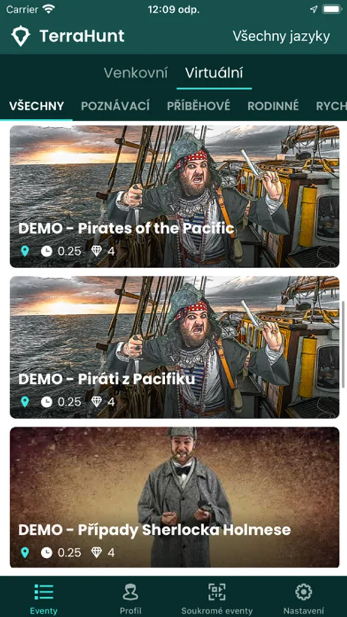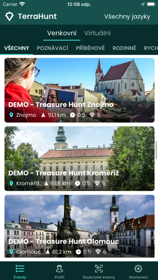 TerraHunt is a GPS app for cell phones and tablets. You can look forward to outdoor games such as Treasure Hunt, Mystery Trail or Challenge Tour. These take place usually in the historical centers of cities or other interesting locations. You can also play virtual escape games and simple quizzes right in your home or office. The app can also be used for the implementation of outdoor/indoor team buildings or virtual team buildings.
