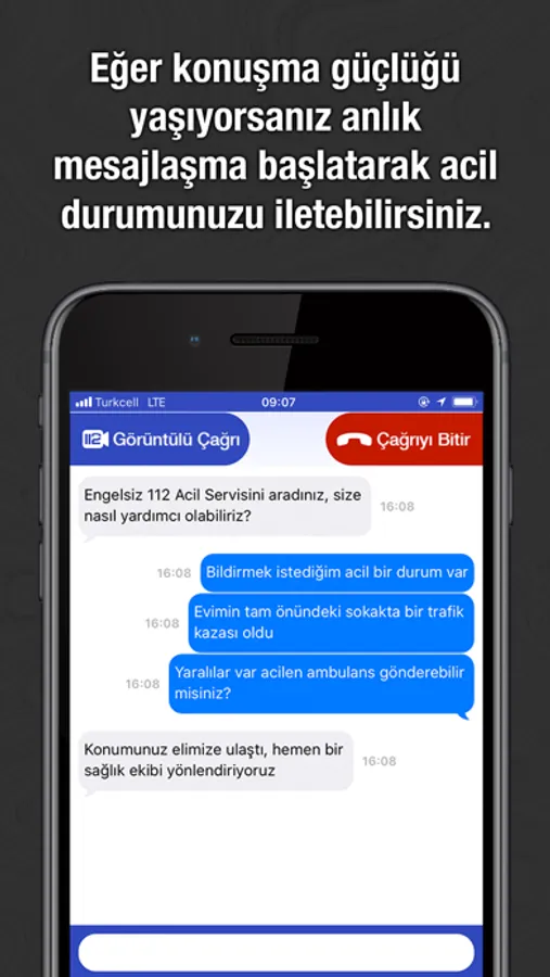 Engelsiz 112 uygulaması ile işitme engelliler 112 acil çağrı merkezini görüntülü arayabilir, işaret dili kullanarak tercümanlar aracılığıyla uzmanlara aciliyetlerini bildirebilirler. Acil çağrı başlatıldığında, arayan kişinin yakınlarına ait iletişim bilgileri ve rahatsızlık detayları otomatik olarak uzmanlara iletilir. Çağrı yapan cihazın konum bilgileri anlık olarak 112 ekipleri tarafından gözlenir ve en hızlı cevap süresi yakalanmaya çalışılır.
