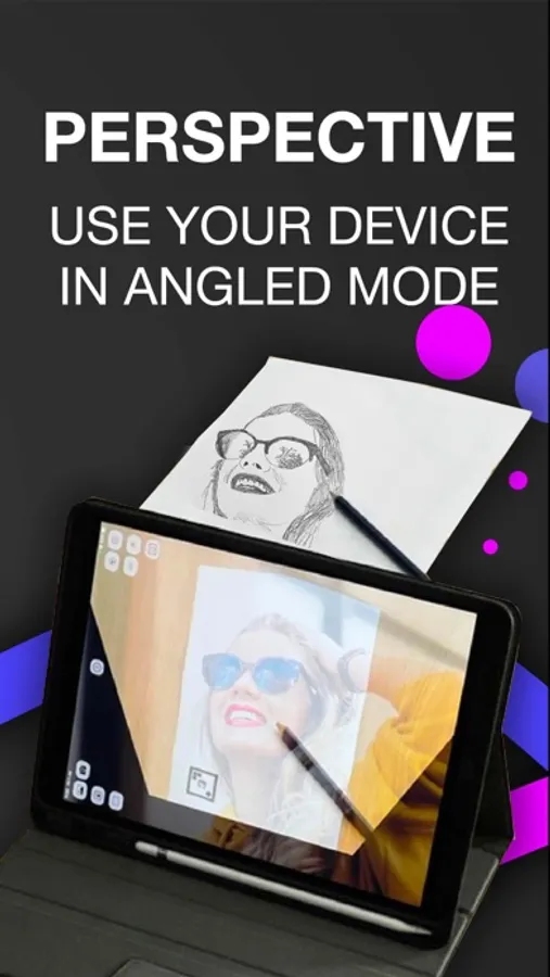 You don't have to keep your device perpendicularly if you don't have a stand, you can also keep it angled, perspective mode will remove any distortion and you will be able to create your artworks without any particular effort. You just have to set it with the guidelines helper image!
