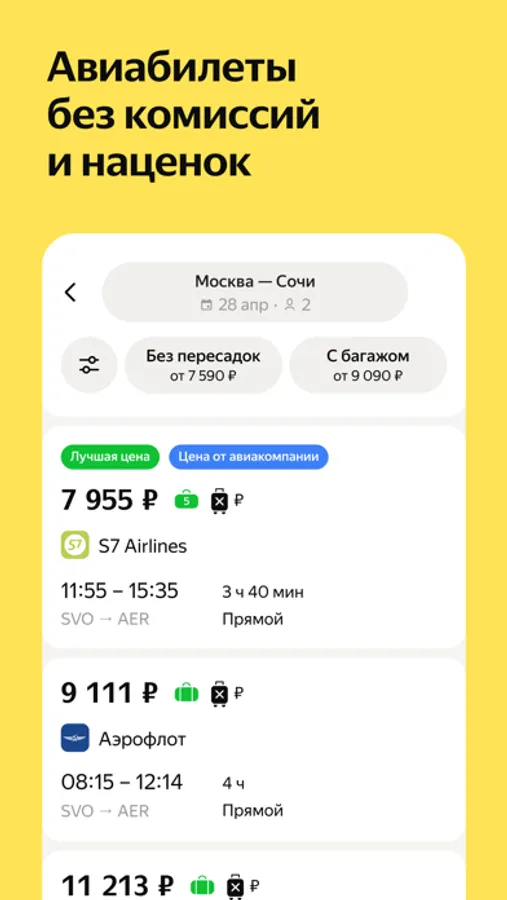 Если вы еще сомневаетесь, где вас ждут самые дешевые авиабилеты, просто зайдите в приложение, введите даты, пункт назначение и убедитесь сами. Яндекс Путешествия работает с авиакомпаниями напрямую, позволяя вам совершить самый выгодный заказ авиабилетов без наценок и комиссий.
