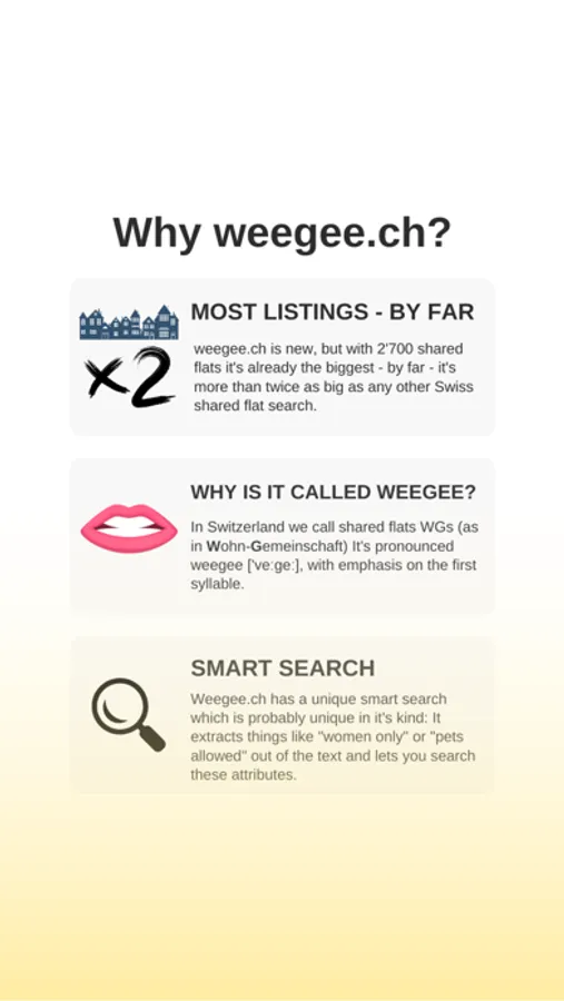 Would you like to save money and live in a shared flat? Or are you sick of living alone and want some company? Search for a shared flat on Switzerlands biggest shared flat portal, having twice as many listings as any other site. On the weegee.ch app you can search within cities, zipcodes, regions (Bezirke) and even whole cantons. You can search for very women-only flats or very even more specific.