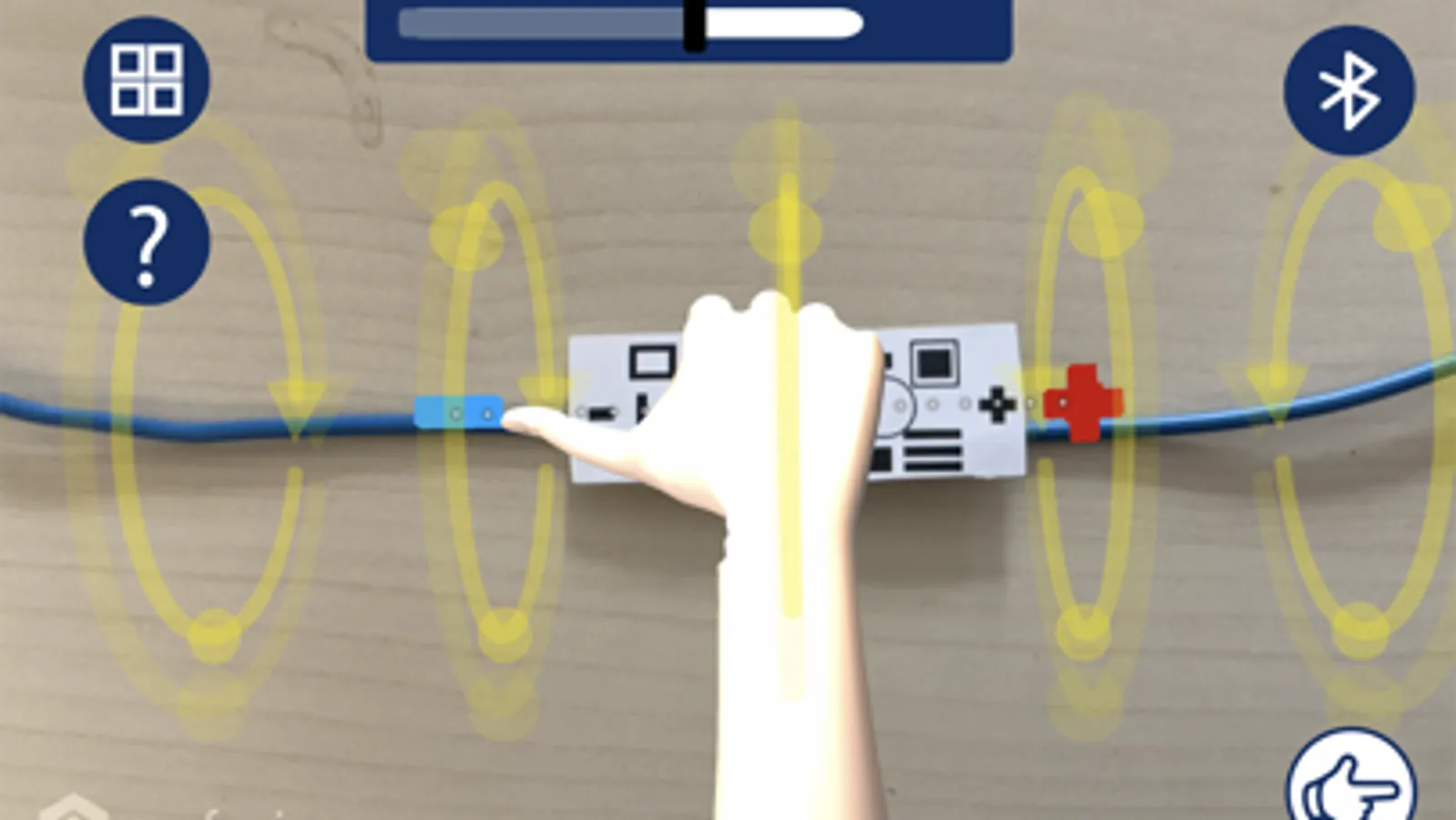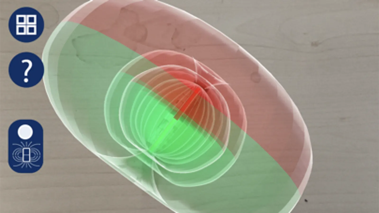 Die Applikation soll Schüler*innen in einer korrekten Modellbildung des Magnetfeldes unterstützen. Dafür verknüpft sie am realen Experiment gemachte Beobachtungen (Spannungsänderungen, Stromfluss, Anziehung) mit entsprechenden, durch AR auf das Experiment projizierten dreidimensionalen physikalischen Modellvorstellungen. Dies verbindet auf intuitive Art und Weise beispielsweise die Beobachtung eines Spannung bei einer Spule bei der Näherung eines Stabmagneten mit der Visualisierung des Magnetfeldes und den dadurch in der Spule abgelenkten virtuelle Elektronen.