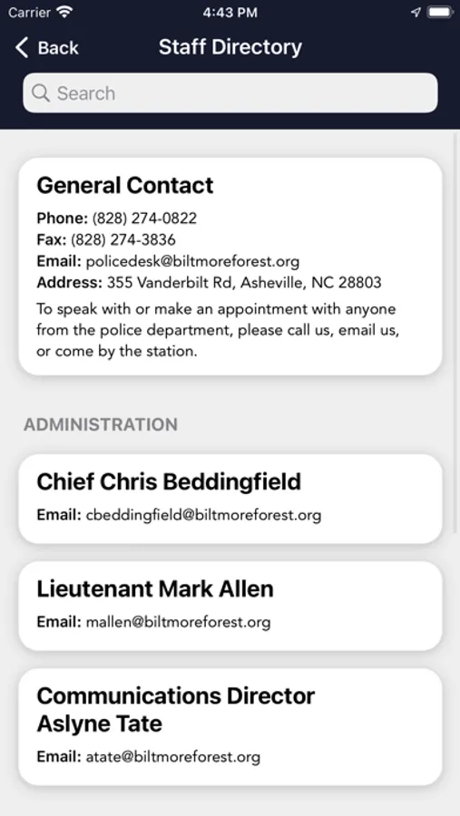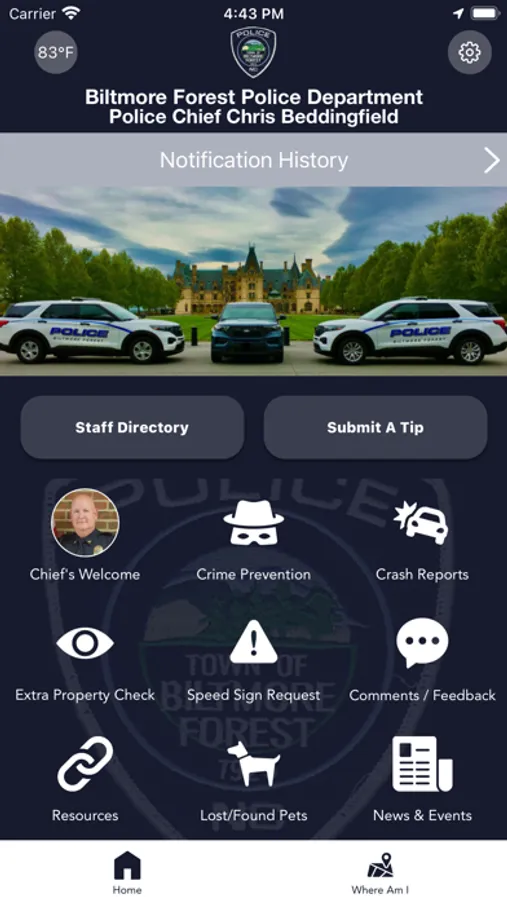The Biltmore Forest Police Department mobile application is an interactive app which will help improve our communication with the citizens of Biltmore Forest and surrounding area. The purpose of this app is to improve our ability to communicate with our citizens. Citizens may submit a crime tip directly through the app, as well as see and share social media posts. By empowering people through technology, the Biltmore Police Department will be able to better protect our county.