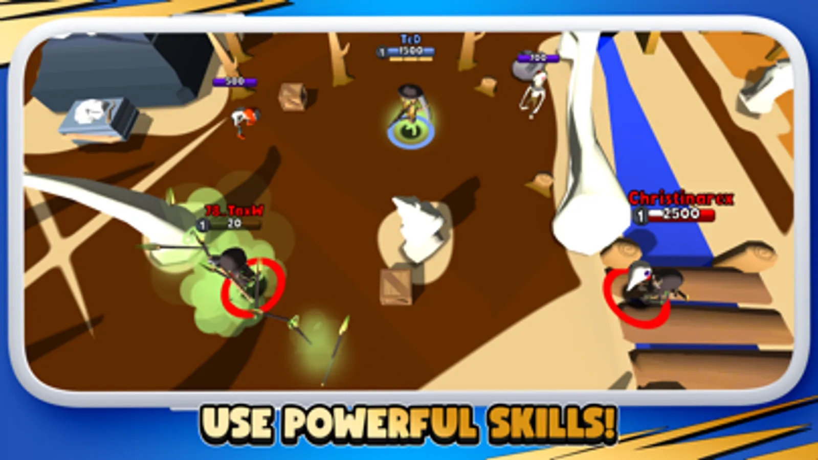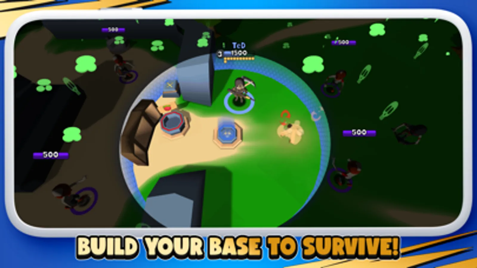 Choose one of many different pickaxes and enter the arena. Use your pickaxe to gather resources, upgrade your hero, and build things that will ensure your survival and lead you to victory.