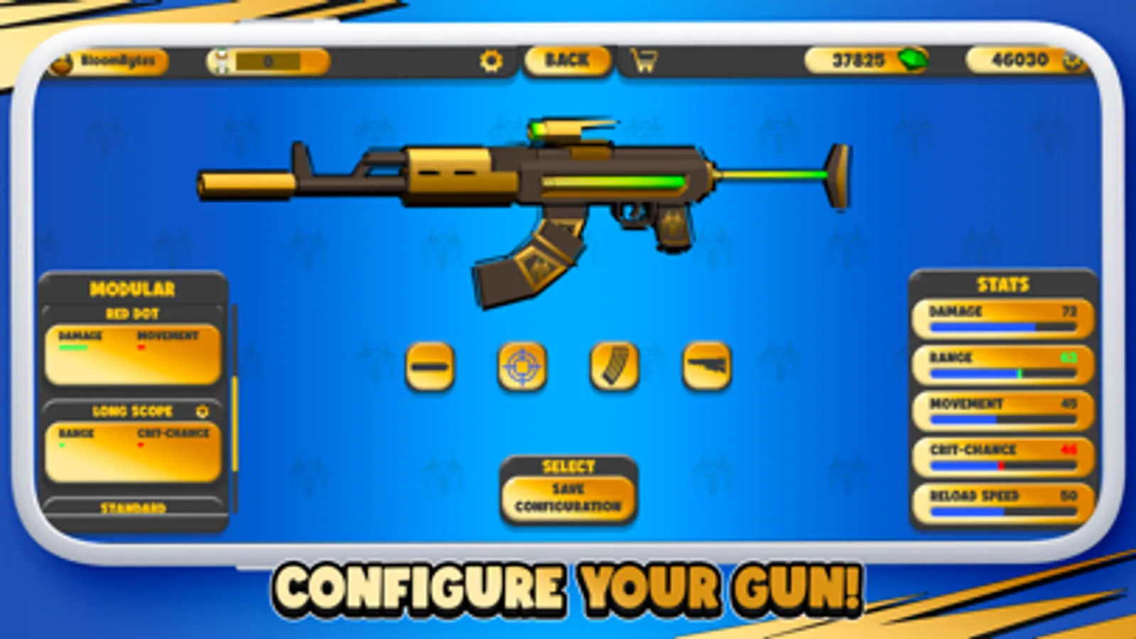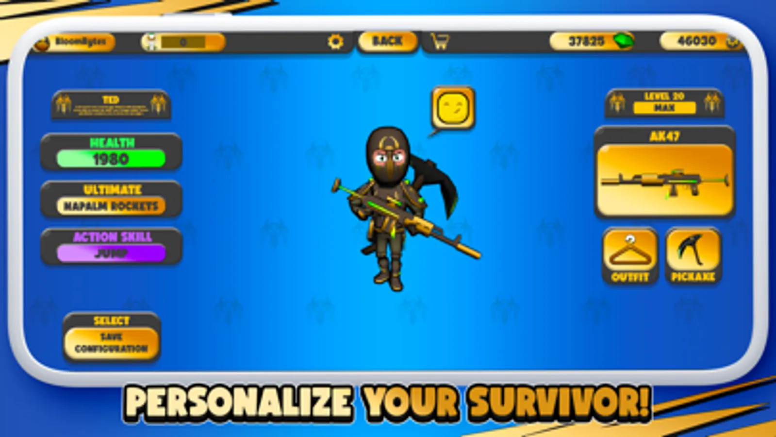 Collect experience points for your hero and upgrade him to a new level! Get new weapon upgrades to improve your weapon and customize your hero to your personal play style. Upgrade shields, medikits and other equipment that you can build in the arena. Earn experience points for your equipment to give you the edge you need to survive in the Battle Royale arena.