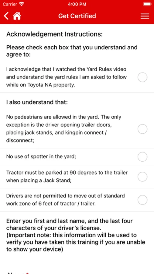 The TSCS Driver application allows the driver to confirm their shipment pickups and automatically communicate the pickups with Toyota. It also includes a one stop shop for safety videos that are required to be reviewed before accessing Toyota’s yard.