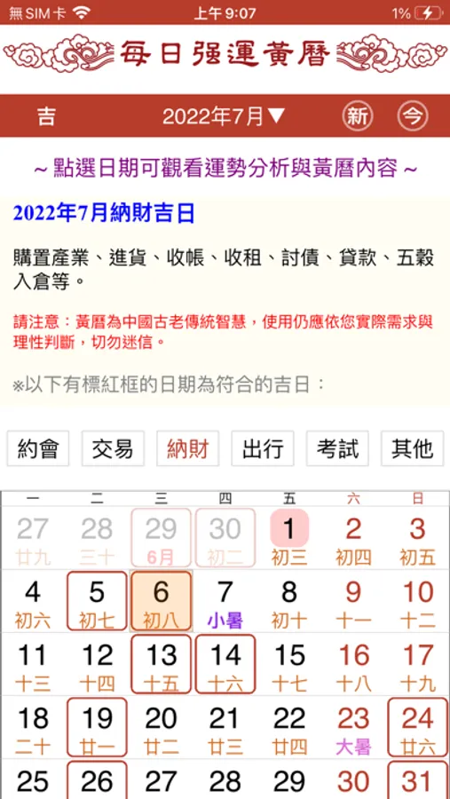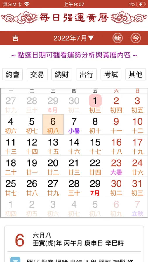 以萬年曆與黃曆版面為介面,可依需求快速查詢宜忌事項,並可知道當日的宜忌、吉方、吉位、吉時等事項。功能強大,試用便知。