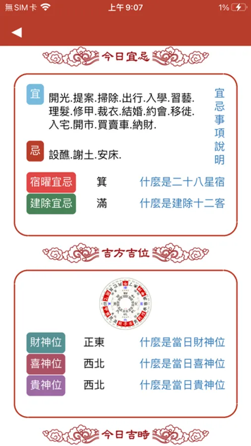 4、今日吉時顯示黃曆當日的「登貴吉時」,以及吉利神煞聚集的「每日吉時」。