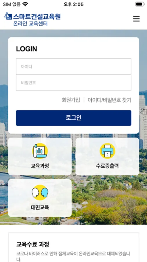 (재단법인) 스마트건설교육원은 국토교통부이 지정하는 종합 교육기관으로서 건설기술인의 법정의무교육 및 시설물안전교육을 진행하고있습니다. 스마트건설교육원은 혁신적 스마트 건설기술 교육으로 건설사업의 디지털화와 교육생의 생산성 안전성의 향상을 선도하고있습니다.