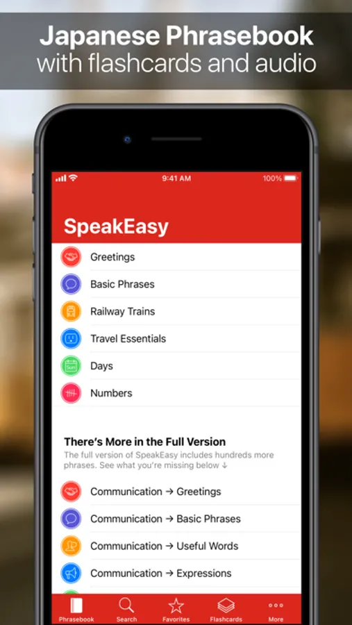 • 160 essential travel phrases with both Japanese and phonetic translations plus audio. Over 1,000 phrases are available in the Complete Edition.
