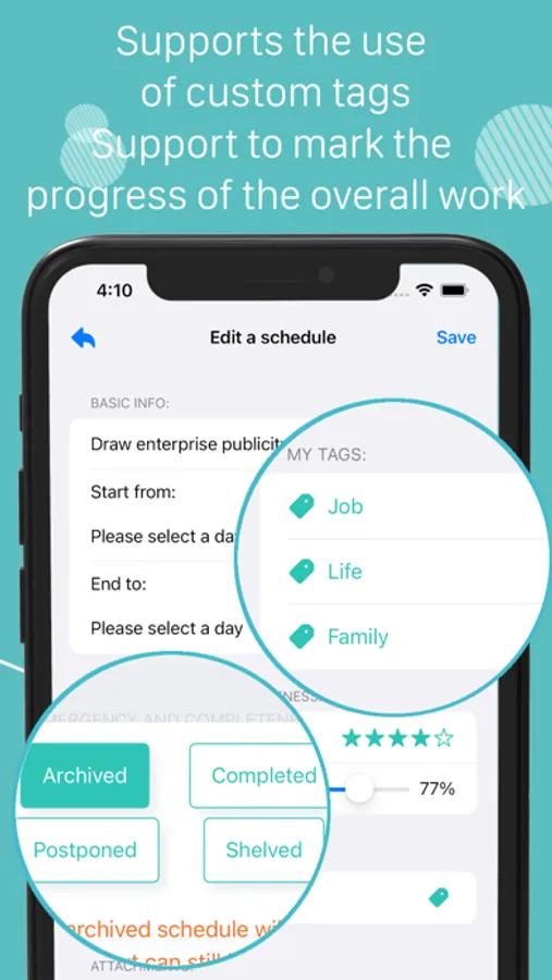 You can set a date range(including a start date or a deadline ,or both) for a schedule ,and set a custom tag if necessary.