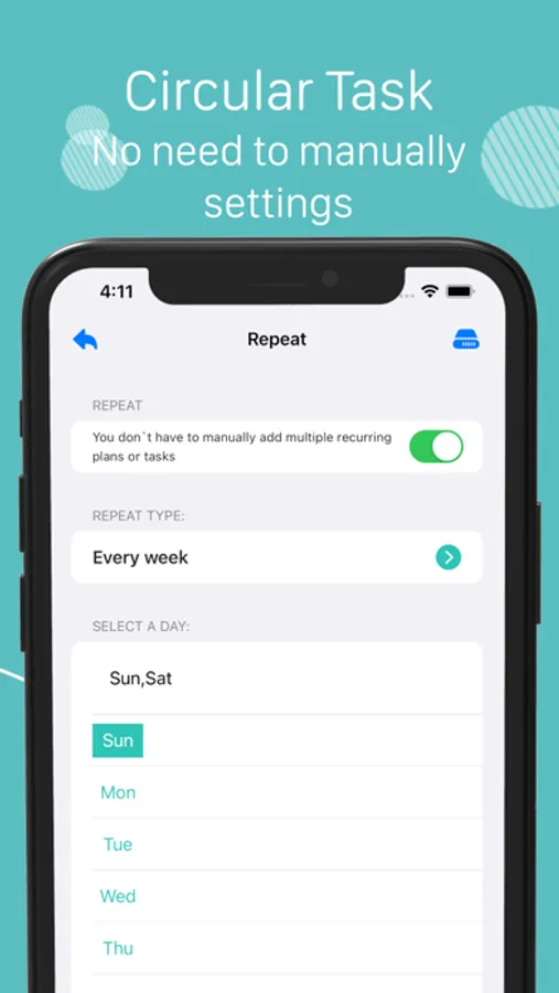 For each subdivided task, you can set it to repeat automatically according to the actual situation: repeat on a fixed number of days every week or every month , or every day.
