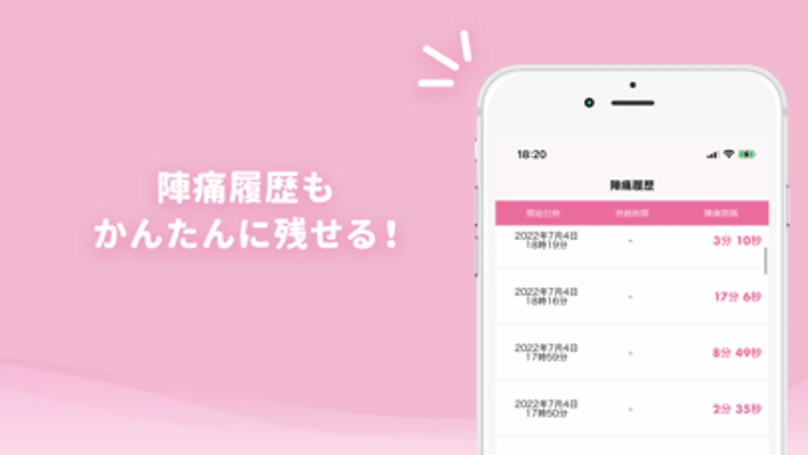 計測した陣痛間隔の履歴を一覧で確認することができます。