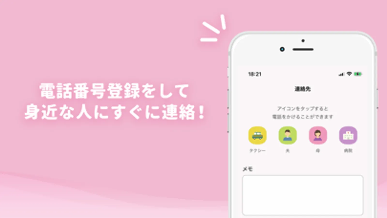 身近な方、病院などの電話番号を登録しておけば、アプリからタップするだけで連絡することができます。