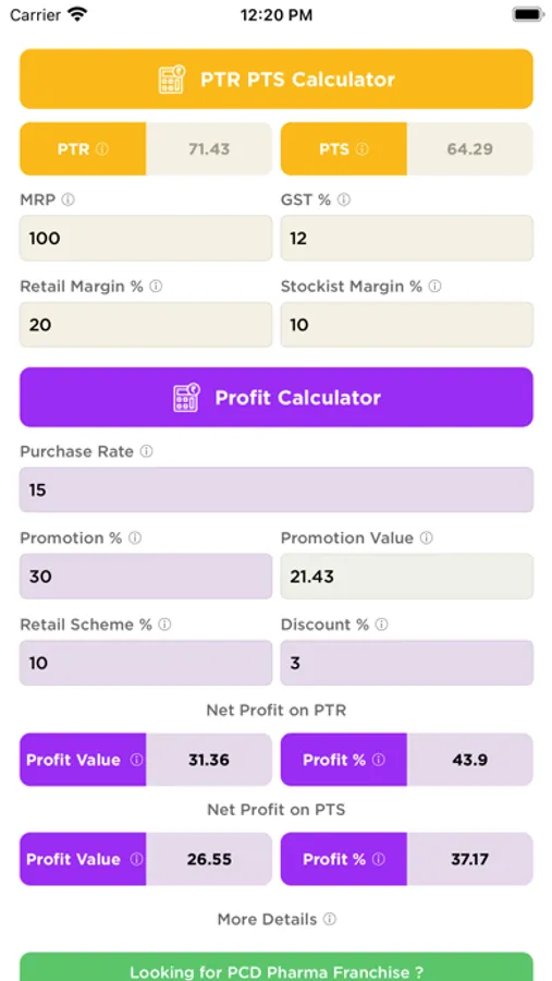 The answer is PTR and PTS calculator. Using this app you can simply get all results in fractions without manual calculation or other calculator. After lot of search and suggestions of stockiest we create this App to get accurate results of PTR and PTS for PCD pharma Franchise.