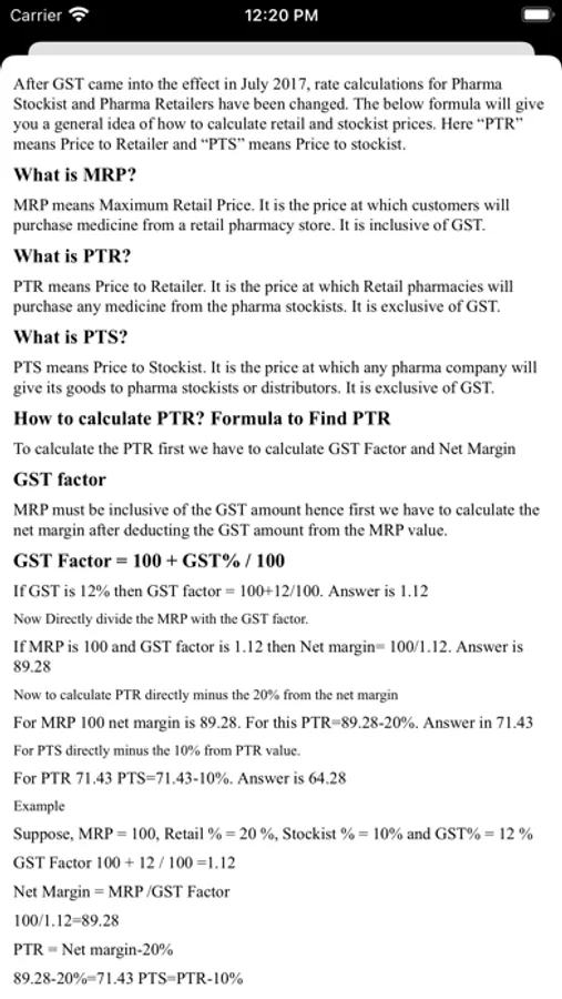 After implementation of GST in Taxation, rate calculations for Pharma Stockist and Pharma Retailers has been changed. Below formula will give you general idea how to calculate retail and stockist margin. Here PTR means Price to Retailer and PTS means Price to stockist. You can also calculate net scheme. For example, if you want give scheme like 10% than this calculator automatically calculate net scheme value according to the percentage you entered. You don't need to manual calculation and no chance for mistake using this calculator app.