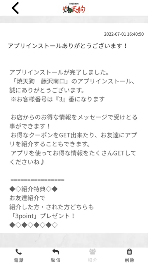 焼天狗のアプリをSNSを通じてお友達に紹介する事ができます。