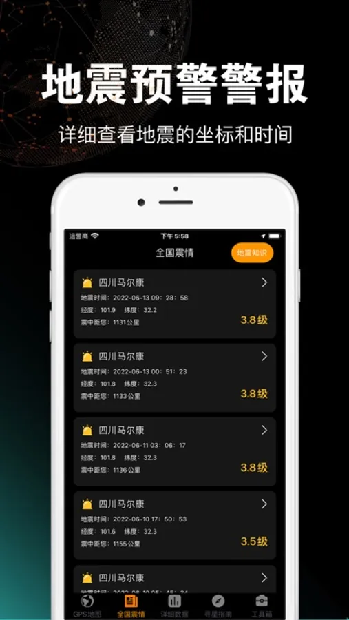 地震预警-地震监测,提供GPS指南针地图显示,显示海拔朝向气压磁力经纬度环境空气沸点湿度等专业数据,实时更新全国主要震情,提供地图查看方式,寻星指南提供多种方位朝向查询,支持水平仪,工具箱模块提供多种单位转换,经纬度转换等,支持房贷计算器、公积金计算器、二维码条形码识别、二维码生成等功能。