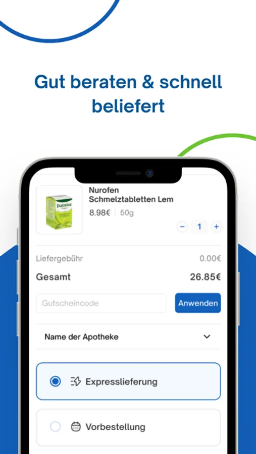 Neben der schnellen Lieferung liegt uns vor allem die gute Beratung durch die jeweilige Apotheke am Herzen. Bei Fragen zu deinen ausgewählten Produkten oder bestimmten Medikamenten, kannst du direkt mit der Apotheke telefonieren und dich auch schon bald direkt per Chat mit der Apotheke austauschen.
