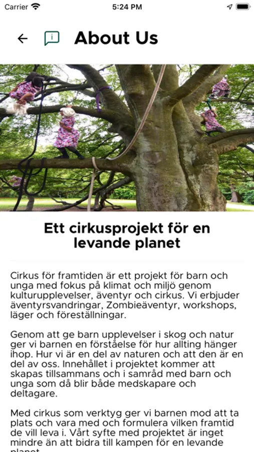 Denna app har tagits fram inom projektet Cirkus för framtiden. Ett treårigt barn och ungdomsprojekt finansierat av Allmänna Arvsfonden där vi jobbar med fokus på klimat och miljö genom cirkus, naturupplevelser och äventyr. Innehållet består av en mängd olika aktiviteter för barn och ungdomar, och ska stimulera fantasi för att drömma om något nytt och bättre, samt ge mod för att försöka göra drömmen till verklighet.