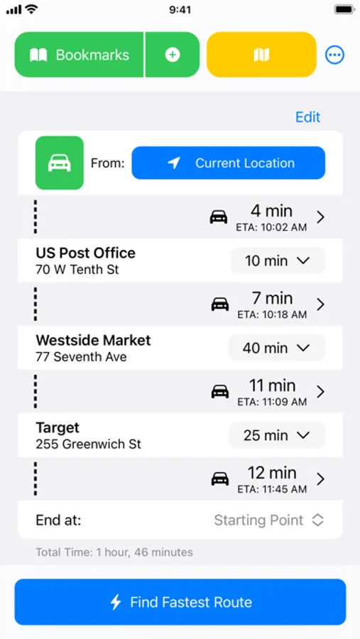 Find the fastest route with Fast Track! Simply enter in all the stops you need to make, and Fast Track will determine the best route to minimize your travel time.